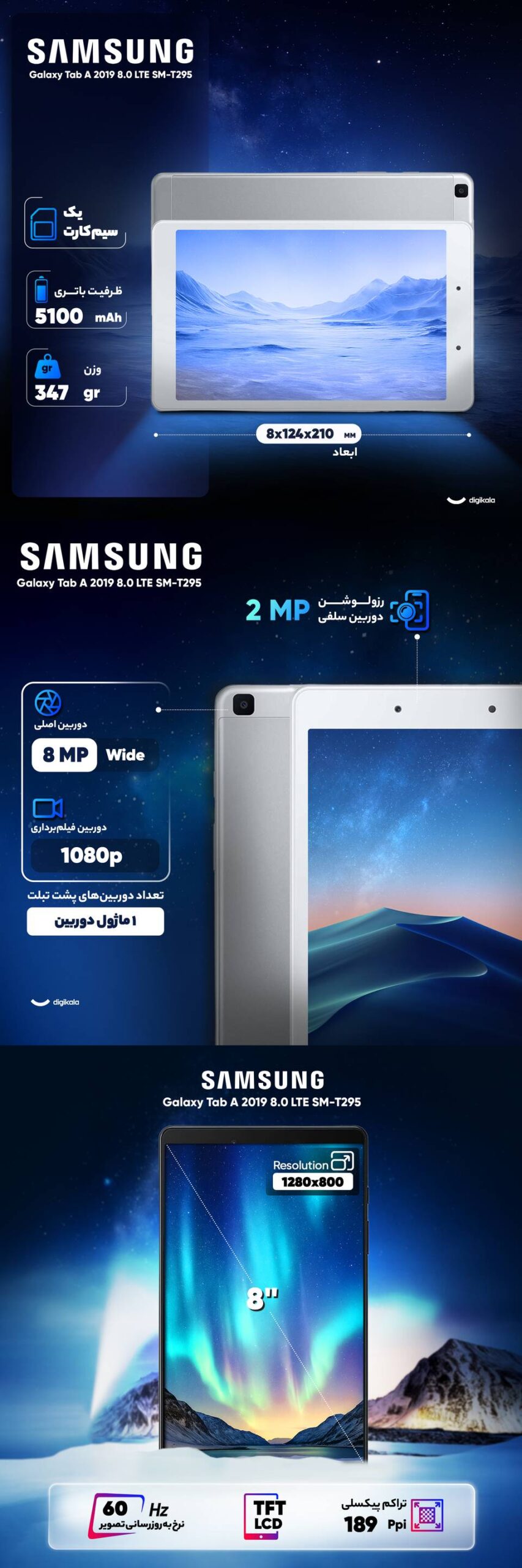 تبلت Samsung Galaxy Tab A 8.0 یکی از تبلت های میان رده سامسونگ به حساب می رود که در سال 2019 میلادی رونمایی و روانه بازار شد. مشخصات سخت افزاری و نرم افزاری متوسط و حضور برخی قابلیت های کاربردی، Tab A 8.0 را به گزینه ای مناسب در میان تبلت های میان رده تبدیل کرده است. صفحه نمایش Tab A 8.0، صفحه نمایشی 8.0 اینچ و از نوع TFT می باشد. رزولوشن این صفحه نمایش برابر با 1280 × 800 پیکسل و تراکم پیکسلی آن نیز برابر با 189 پیکسل بر اینچ می باشد. چیپست به کار گرفته شده در Tab A 8.0، چیپست میان رده Snapdragon 429 می باشد که از یک پردازنده هشت هسته با کلاک 2.0 گیگاهرتز و همچنین پرردازنده گرافیکی Adreno 504 تشکیل شده است. در نظر گرفته شدن حافظه رم 2 گیگابایتی در کنار این چیپست میان رده، قدرت پردازشی متوسطی را برای Tab A 8.0 به ارمغان می آورد به طوری که این تبلت قادر به اجرا بازی ها و برنامه های نسبتا سنگین نیز می باشد. حافظه داخلی Tab A 8.0 برابر با 32 گیگابایت می باشد که البته افزایش آن تا 1000 گیگابایت دیگر نیز به کمک کارت های حافظه جانبی، امکان پذیر می باشد. سامسونگ تبلت جدید خود را به یک دوربین 8 مگاپیکسل در قسمت پشت تبلت و به عنوان دوربین اصلی مجهز کرده است در حالی که در قسمت جلو تبلت نیز یک دوربین 2 مگاپیکسل به عنوان دوربین سلفی تبلت به کار گرفته شده است. از دیگر ویژگی های تبلت میان رده و جدید سامسونگ می توان به سیستم عامل Android 9.0 PIE، درگاه MICRO USB و باتری قدرتمند 5100 میلی آمپر ساعت، اشاره کرد. خرید تبلت Samsung Galaxy Tab A 8.0 به کاربرانی که قصد انجام کارهای روزمره خود یا اجرا برخی برنامه های نه چندان سنگین را در صفحه نمایش معمولی و با کیفیت Tab A 8.0 داشته و به تماشای فیلم و ویدیو در تبلت نیز علاقه مند می باشند، پیشنهاد می شود.