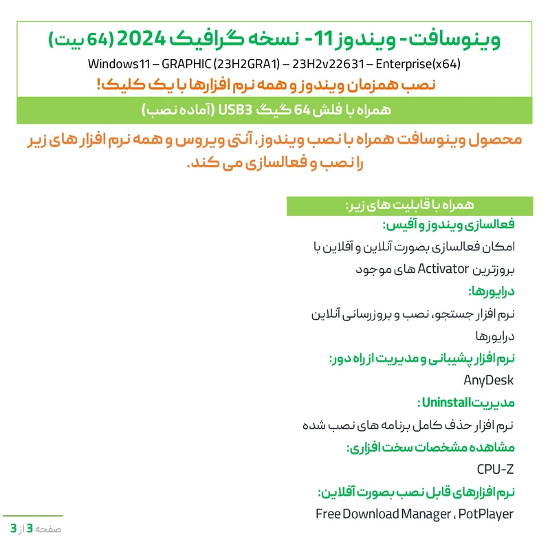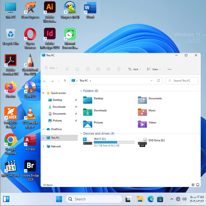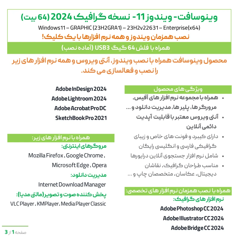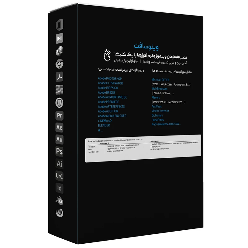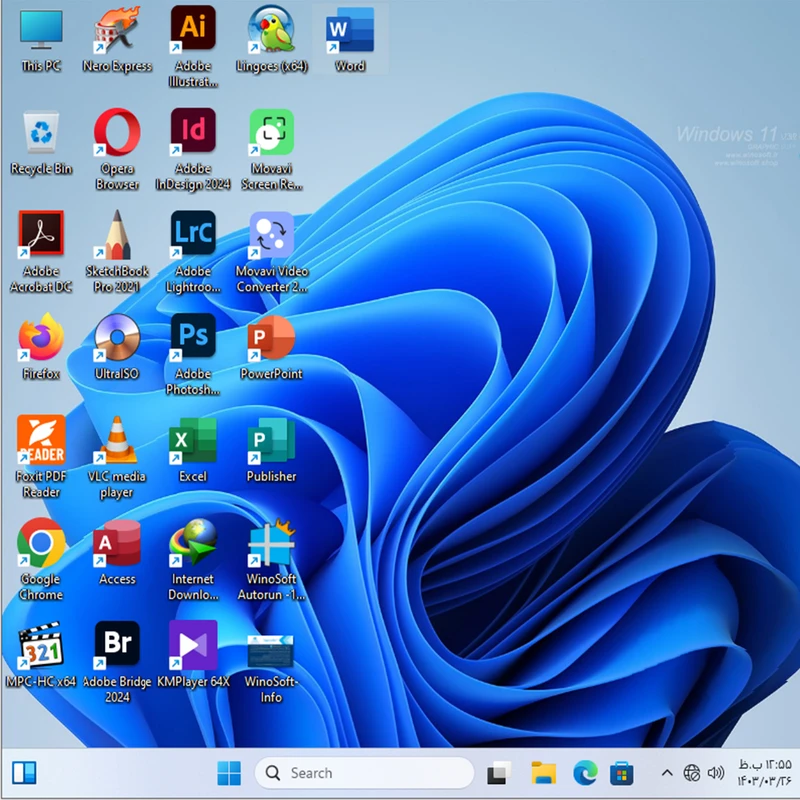 نصب همزمان ویندوز و نرم افزارها با یک کلیک (وینوسافت – ویندوز 11 رسمی – نسخه گرافیک 2024 – شامل فتوشاپ، ایلوستریتور و…): انتخاب درست ویندوز، آنتی ویروس قوی و سایر نرم افزارها، سپس دانلود، نصب و فعال سازی اونها فرایندی زمانبر و پردردسره و تصمیم نادرست میتونه سبب نصب از اول بشه! راه حل مناسب، انتخاب وینوسافت است که خودش برات نصب می کنه و با نصب همزمان ویندوز و نرم افزارها فقط با یک کلیک به عنوان سریع ترین و آسان ترین روش نصب ویندوز شناخته میشه. فرایند نصب وینوسافت مثل هر ویندوز دیگه ای است، با این تفاوت که تنها کاری که در فرایند نصب انجام می دهید، انتخاب پارتیشن برای نصب ویندوز و زدن کلید NEXT است: همین! حتی نیازی به پاسخ دادن به سوالات مراحل نصب ویندوز هم ندارید، بعد از دقایقی نصب تمام می شود و شما وارد دسکتاپ ویندوز می شوید: به همین راحتی! وینوسافت خودش ویندوز و آنتی ویروس و سایر نرم افزارها رو نصب کرده و تمام نرم افزارهایی که نیاز به فعال سازی دارند را فعال می کنه: بلافاصله پس از بالا آمدن ویندوز می تونید فتوشاپ یا هر نرم افزاری را باز کنید و فارسی تایپ کنید: چون صفحه کلید فارسی هم اضافه شده است! نسخه گرافیک برای طراحان گرافیک، نقاشان دیجیتال، عکاسان، متخصصان چاپ و… آماده گردیده است: در این نسخه همراه با نصب ویندوز، آنتی ویروسی معتبر با قابلیت آپدیت آنلاین دائمی ، Adobe Photoshop CC 2024 , Adobe Illustrator CC 2024 , Adobe Bridge CC 2024 , Adobe InDesign 2024 , Adobe Lightroom 2024 , Adobe Acrobat Pro DC 2018 , SketchBook Pro 2021 نیز نصب و فعال سازی می شوند. علاوه بر اینها مجموعه آفیس (Word, Excel, PowerPoint و… )، مرورگرها (Chrome, Firefox و… )، پلیرها (VLC Player, KM Player و… )، نرم افزار مدیریت دانلود (Internet Download Manager)، نرم افزار مشاهده فایل PDFـ (Adobe Acrobat Reader)، نرم افزار تصویربرداری یا کپچر از صفحه و پیش نیازهای ویندوز و نرم افزارها (NET Framework, DirectX و…) فقط با همان یک کلیک و همراه با نصب ویندوز، نصب می شوند! این نسخه شامل فونت های متنوع و پرکاربرد فارسی بعلاوه فونت های خاص و زیبای گرافیکی فارسی و انگلیسی ، تنظیم کیبورد فارسی، تنظیمات تقویم شمسی و… نیز هست.