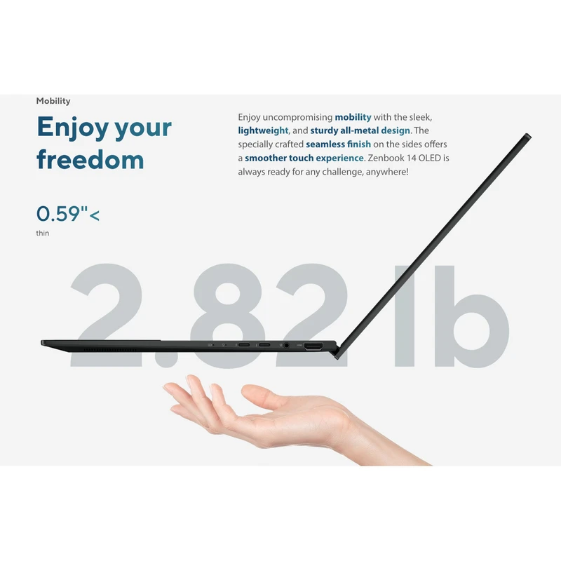 لپتاپ ایسوس ZenBook 14 OLED Q415MA با طراحی زیبا و سادهاش، شما را یاد مکبوک اپل میاندازد. این لپتاپ چنان ظاهر شیکی دارد که میتواند از همان لحظه اول توجه شما را به خود جلب کند. همچنین با وزن ۱.۲۸ کیلوگرمی و ضخامت ۱۴.۹ میلیمتری محصول، حملونقل آن اصلا کار سختی نیست. بنابراین اگر زیاد با لپتاپ خود جابهجا میشوید، با این مدل احساس خستگی و ناراحتی نخواهید داشت. ایسوس در بخش کیفیت ساخت نیز سنگتمام گذاشته است؛ جایی که بدنه ZenBook 14 OLED از جنس آلومینیوم ساخته شده و با بهرهمندی از استاندارد نظامی، خیال کاربران از بابت مقاومت و استحکام بالای آن راحت میشود.