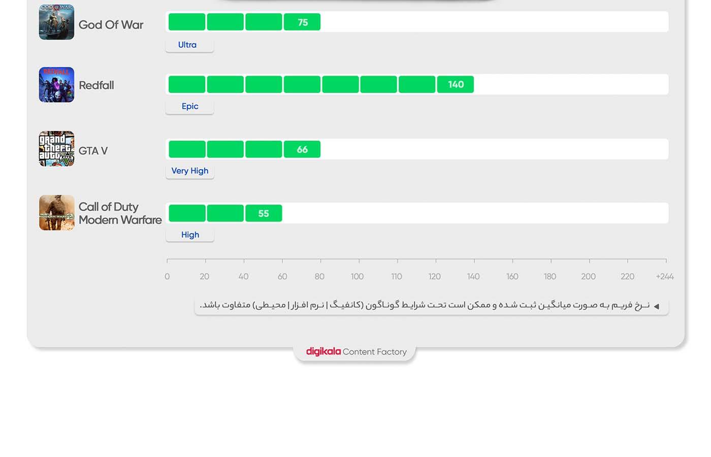برای بررسی بهتر عملکرد این لپتاپ گیمینگ، چند بازی مختلف را با وضوح FHD و ۳۲ گیگابایت حافظه رم، اجرا و بررسی کردیم. بازی Call of Duty Modern Warfare 2 روی تنظیمات گرافیکی High، با میانگین ۵۵ فریم در ثانیه اجرا شد. بازی Redfall با تنظیمات Epic، میانگین ۱۴۰ فریم در ثانیه را به ما داد. در بازی Ghost of Tsushima نیز با گرافیک High و DLSS خاموش، به میانگین ۶۵ فریم در ثانیه رسیدیم.