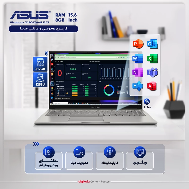 لپتاپ Vivobook X1504ZA یکی از لپ تاپهای پرطرفدار و پرفروش از برند ایسوس است که در کنار قیمت مناسب، کیفیت ساخت بسیار بالا و طراحی ساده و ظاهری شیک و همه پسند، از مشخصات سختافزاری قابل توجهای هم استفاده میکند. این لپ تاپ به لطف ابعاد مناسب و وزن کم برای حمل و جابجایی کاملا مناسب است. لازم به ذکر است که سختافزار این لپتاپ به خوبی برای این رده کاربری انتخاب شده و از پس نیاز کاربران برمیآید. پردازنده مرکزی Core i7 نسل 12 به همراه پردازنده گرافیکی یکپارچه Iris Xe این لپ تاپ در کنار 8 گیگابایت حافظه رم، سرعت و قدرت کافی برای پردازشهای سبک و متوسط را در اختیار کاربران میگذارند. در کنار این موارد، لازم است ذکر شود که استفاده از حافظه SSD پر سرعت در این لپ تاپ هم کمک قابل توجهای به ارتقای تجربه کاربری میکند و همچنین قابلیت ارتقا دارد.