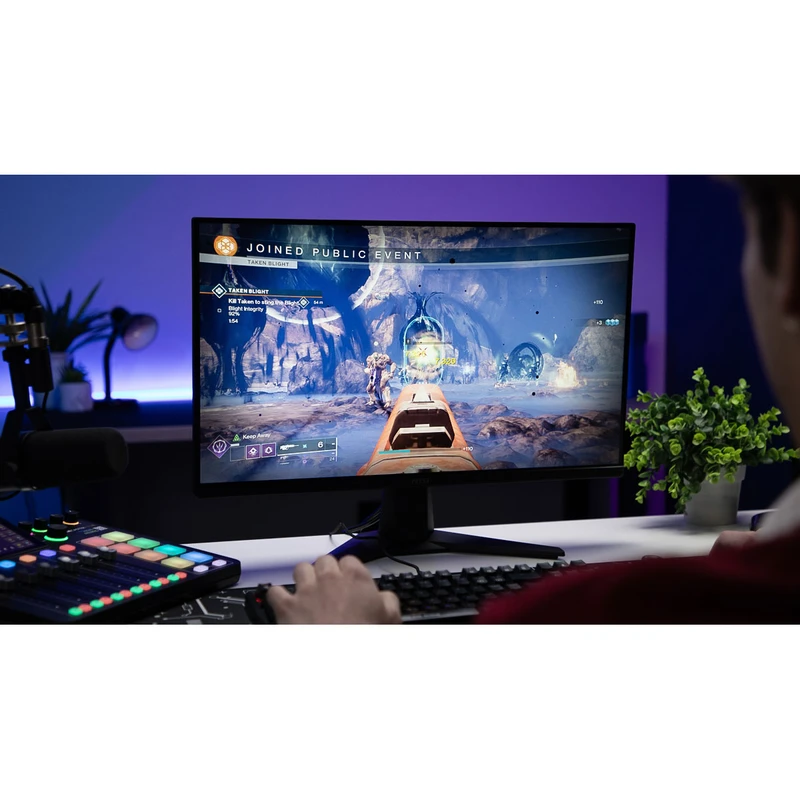 استفاده از پنل IPS در این مدل، زوایای دید گسترده 178 درجه را تضمین می‌کند و این یعنی تصاویر از تقریباً هر زاویه‌ای بدون افت کیفیت یا تغییر رنگ قابل مشاهده هستند، که برای بازی‌های گروهی یا تماشای محتوا عالی است. با روکش صفحه‌نمایش مات، بازتاب نور محیط به حداقل می‌رسد و چشمان شما در طول ساعات طولانی بازی کمتر خسته می‌شوند. این مانیتور با نور پس‌زمینه LED و رزولوشن Full HD (1920×1080 پیکسل)، تصاویری واضح و با جزئیات کافی را ارائه می‌دهد. یکی از برجسته‌ترین ویژگی‌های آن، توانایی نمایش 1.07 میلیارد رنگ با عمق رنگ 10 بیت است که باعث می‌شود بازی‌ها و محتوا با رنگ‌هایی زنده و دقیق به نمایش درآیند. پوشش رنگی 115% sRGB، 75% DCI-P3 و 80% Adobe RGB نیز نشان‌دهنده دقت بالای رنگ در این مانیتور است.