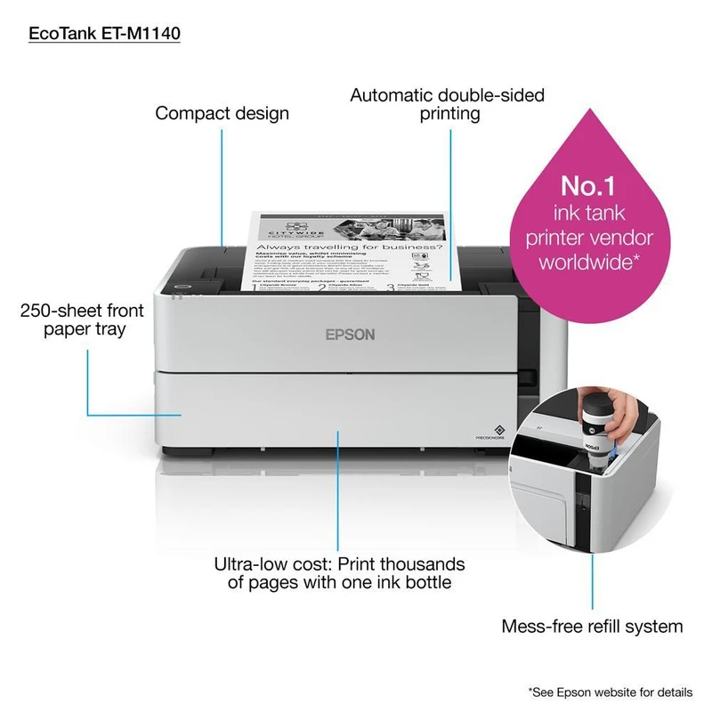 پرینتر اپسون «EcoTank ET-M1140» در ابعاد 375 x 347 x 151 میلیمتر بهراحتی در گوشهای از میز کار شما قرار میگیرد. این دستگاه با پورت USB 2.0 که دارد، بهراحتی به سیستم شما متصل میشود. از دیگر مزایای پرینتر «M1140» قابلیت چاپ دورو (Duplex) است که موجب صرفهجویی در وقت و کاهش هزینههای مصرفی میشود. کاست کاغذ آن قابلیت نگهداری تا 250 برگ کاغذ ساده A4 را دارا است و کاغذ کش آن توانایی کشش کاغذ از 64 گرم تا 256 گرم را دارد. همچنین سرعت این پرینتر، 39 صفحه در دقیقه است که روند کار کاربران را سرعت میبخشد. خریداران میبایست به این نکته آگاه باشند که با استفاده از جوهرهای اصلی (Original) اپسون، برخلاف تصور اشتباهی که رایج شده است ، در صورت عدم استفاده از پرینتر بهصورت 2 الی 3 ماه نیز جوهرهای اصلی اپسون خشک نمیشود و هیچ صدمهای به هد (Head) پرینتر وارد نمیشود.