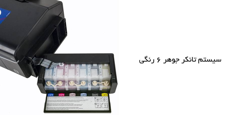 پرینتر L805 از مخزن جوهر 6رنگی بهره میبرد. سیستم رنگ 6تایی، رنگهای سیستمهای 4رنگی را داشته و علاوهبر آن رنگهای قرمز روشن و آبی روشن را هم دارد. سیستم 6 رنگ کیفیت بهتری را در چاپ ارائه میدهد و دقت بیشتری در تولید رنگ دارد. درواقع پرینترهای 6 رنگ پیشرفتهتر از مدلهای 4رنگی بوده و برای کاربرانی که بهصورت حرفهای میخواهند به چاپ عکس بپردازند، مناسبتر است. همانگونه که قبلاً اشاره شد، شعار پرینتر در تبلیغات این محصول این است: «دیگر نگران هزینههای جوهر پرینتر نباشید!» که حقیقت هم دارد. پرینترهایی که از کارتریجهای یکبارمصرف استفاده میکنند، بسیار پرهزینه بوده و کارتریج تعداد بسیار کمی را میتواند چاپ کند و بعد از اتمام جوهر باید با صرف هزینهای زیاد، کارتریج نو را خریداری و استفاده کرد. جوهر مورد استفاده در این پرینتر، درون بطری عرضه میشود.