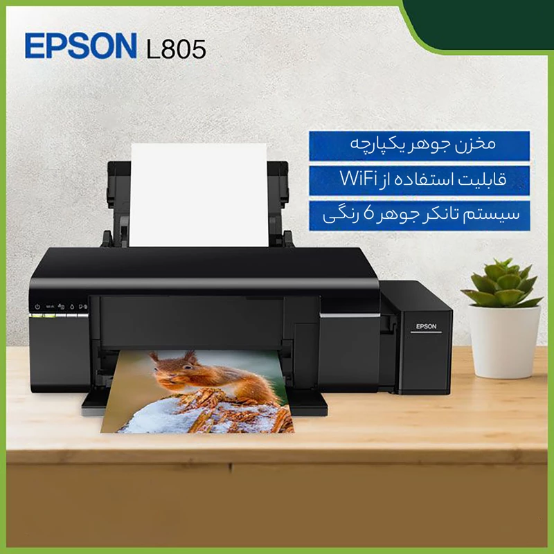 پرینترهای جوهرافشان یکی از دستگاههای لازم در ادارات و کاربردهای خانگی هستند و استفادههای گوناگونی از آنها میشود. پرینتر «L805» از شرکت «اپسون» (Epson) در ابعاد 187×289×547 میلیمتر و وزن 6 کیلوگرم عرضه میشود. چاپ به صورت جوهرافشان و رنگی در وضوح 5706×1440 dpi با استفاده از 90 نازل مشکی و 90 نازل رنگی انجام میشود. میتوانید 5 برگ در دقیقه را به صورت رنگی یا سیاه و سفید چاپ کنید. برای چاپ عکس در اندازهی 10×15، حدود 12 ثانیه زمان لازم است. این پرینتر از کاغذهایی با اندازههای A4، A5، A6، B5، C6 (Envelope)، DL (Envelope)، No 10 (Envelope)، 10×15، 13×18 و Legal پشتیبانی میکند؛ همچنین قابلیت چاپ روی «CD» را دارد. چاپ دورو به صورت دستی انجام میشود. ظرفیت سینی کاغذ 120 برگ کاغذ استاندارد و 20 برگ Photo Paper است. ظرفیت سینی خروجی 50 برگ است. چاپگر از طریق درگاه USB به یارانه وصل شده و با برق شهری تغذیه میشود. برق مصرفی دستگاه در حالت چاپ برابر با 13 وات و در حالت Sleep Mode برابر با 1.2 وات است. این چاپگر به مخزن جوهر مجهز است و میتوانید با استفاده از بستهی جوهر T6736، تانکر جوهر را پر کنید.