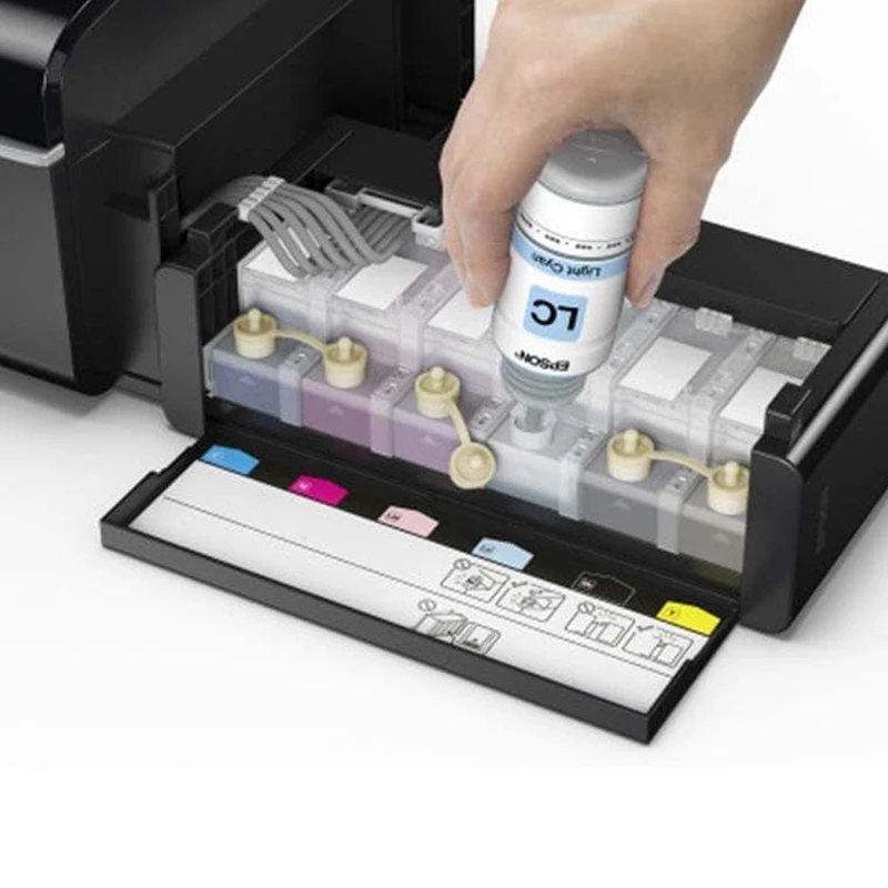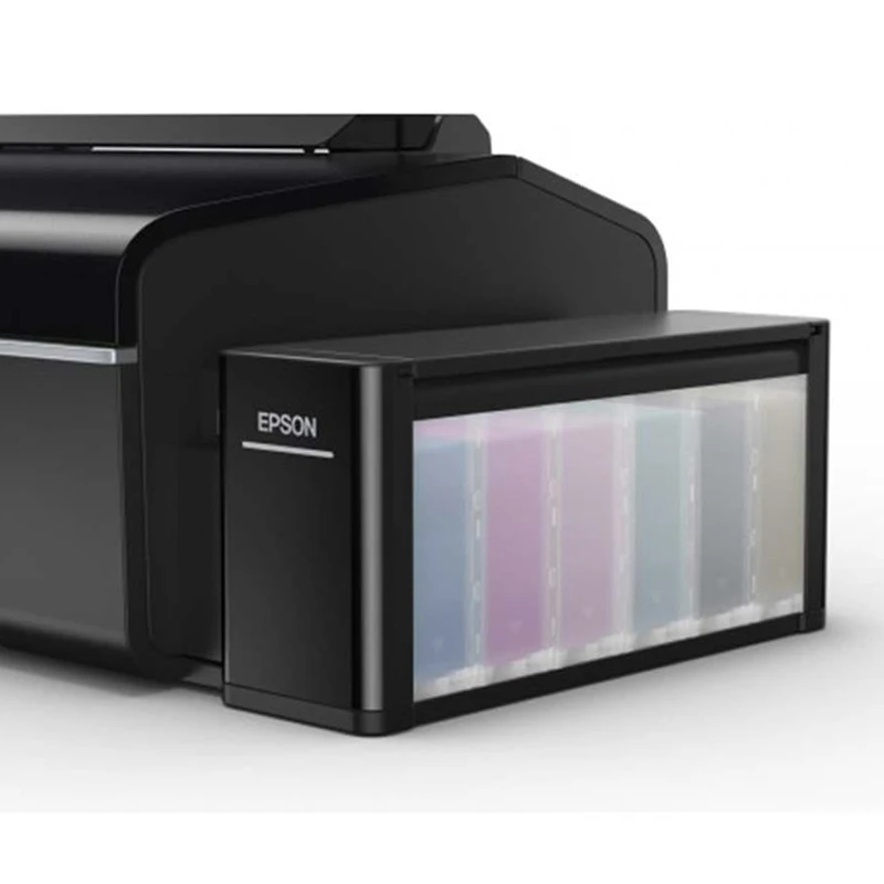 پرینتر L805 از مخزن جوهر 6رنگی بهره میبرد. سیستم رنگ 6تایی، رنگهای سیستمهای 4رنگی را داشته و علاوهبر آن رنگهای قرمز روشن و آبی روشن را هم دارد. سیستم 6 رنگ کیفیت بهتری را در چاپ ارائه میدهد و دقت بیشتری در تولید رنگ دارد. درواقع پرینترهای 6 رنگ پیشرفتهتر از مدلهای 4رنگی بوده و برای کاربرانی که بهصورت حرفهای میخواهند به چاپ عکس بپردازند، مناسبتر است. همانگونه که قبلاً اشاره شد، شعار پرینتر در تبلیغات این محصول این است: «دیگر نگران هزینههای جوهر پرینتر نباشید!» که حقیقت هم دارد. پرینترهایی که از کارتریجهای یکبارمصرف استفاده میکنند، بسیار پرهزینه بوده و کارتریج تعداد بسیار کمی را میتواند چاپ کند و بعد از اتمام جوهر باید با صرف هزینهای زیاد، کارتریج نو را خریداری و استفاده کرد. جوهر مورد استفاده در این پرینتر، درون بطری عرضه میشود.