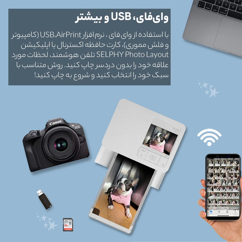 SELPHY CP1500 به دلیل ماهیت تخصصی خود برای عکس، به ظرفیت ورودی ۱۸ برگ مجهز شده که برای چاپ دستهای و استفادههای کوتاهمدت کافی است. سینی خروجی نیز همین تعداد برگ را پشتیبانی میکند، بنابراین مدیریت چاپ بدون افت کیفیت ممکن خواهد بود. این پرینتر از سایزهای کاغذ عکس استاندارد شامل ۴×۶ اینچ، ۵×۷ اینچ و ۸×۱۰ اینچ پشتیبانی میکند و بهترین نتایج را روی کاغذهای عکس براق یا گلاسه ارائه میدهد. عدم وجود سینیهای چندگانه یا تغذیه خودکار (ADF) نشان از تمرکز کامل این مدل بر چاپ تخصصی عکس دارد. این دستگاه طیف خوبی از اتصالات را در اختیار کاربر میگذارد. پورت USB-A برای اتصال مستقیم به رایانه، و Wi-Fi داخلی برای چاپ بیسیم و بدون نیاز به کابل از ویژگیهای آن است. قابلیت اتصال سریع به موبایل از طریق Wi-Fi و پشتیبانی از اپلیکیشن اختصاصی Canon PRINT Inkjet/SELPHY، سرویس Apple AirPrint و Mopria Print Service، فرآیند چاپ را ساده و بدون واسطه کرده است. کاربران میتوانند مستقیماً از کارت حافظه SD نیز فایلهای خود را چاپ کنند که این امکان، بهویژه برای عکاسان با دوربینهای دیجیتال، مزیتی بزرگ محسوب میشود.