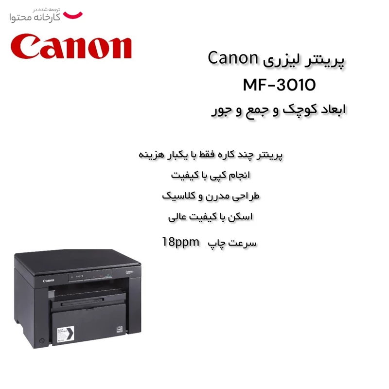 پرینتر چندکاره و لیزری MF3010 ساخت شرکت کانن دستگاهی ارزانقیمت، کمحجم و سریع است که بهراحتی بر روی میز کاریتان جا میشود. سرعت این پرینتر نسبت به مدلهای رقیب خود بسیار مناسب است. از سوی دیگر قابلیتهایی مانند فکس، چاپ دورو و افزایش میزان کاغذ سینی ورودی در این مدل وجود ندارد و اتصال به رایانه تنها از طریق USB صورت میگیرد و امکان استفاده از آن بهصورت مستقیم در شبکه و یا اتصال WiFi در آن وجود ندارد. این دستگاه قطعاً دستگاهی برای استفادههای خانگی و شخصی است و استفاده از آن در محیطهای کاری و تجاری توصیه نمیشود.