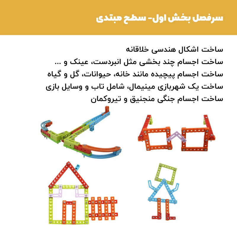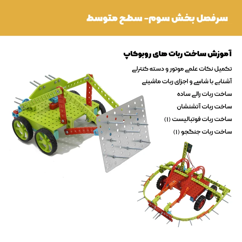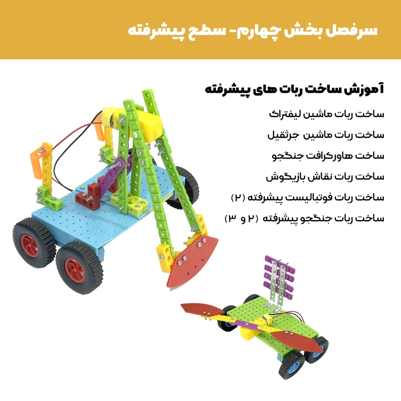 برای مسابقات آماده میشود . آموزش های این مجموعه آموزشی از اتصال پیچ و مهره و ساخت اشکال بسیار ساده شروع شده و به صورت مرحله ای در ویدیوهای بعد دانش آموز با موتور الکتریکی و دسته کنترل آشنا شده و قادر به ساخت اجسام متحرک میشود و پس از ساخت اجسام یک موتوره مقدماتی