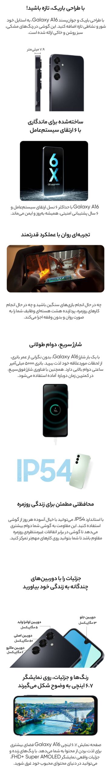A16 4G یک گوشی میان‌رده-اقتصادی جذاب از سامسونگ است که با طراحی مدرن، نمایشگر باکیفیت و نرم‌افزار به‌روز عرضه شده است. این گوشی با وزن 200 گرم، ظاهر شیکی دارد و گواهی IP54 آن را در برابر گرد و غبار و پاشش آب مقاوم کرده است. حسگر اثر انگشت روی لبه گوشی هم امنیت گوشی را افزایش داده است.