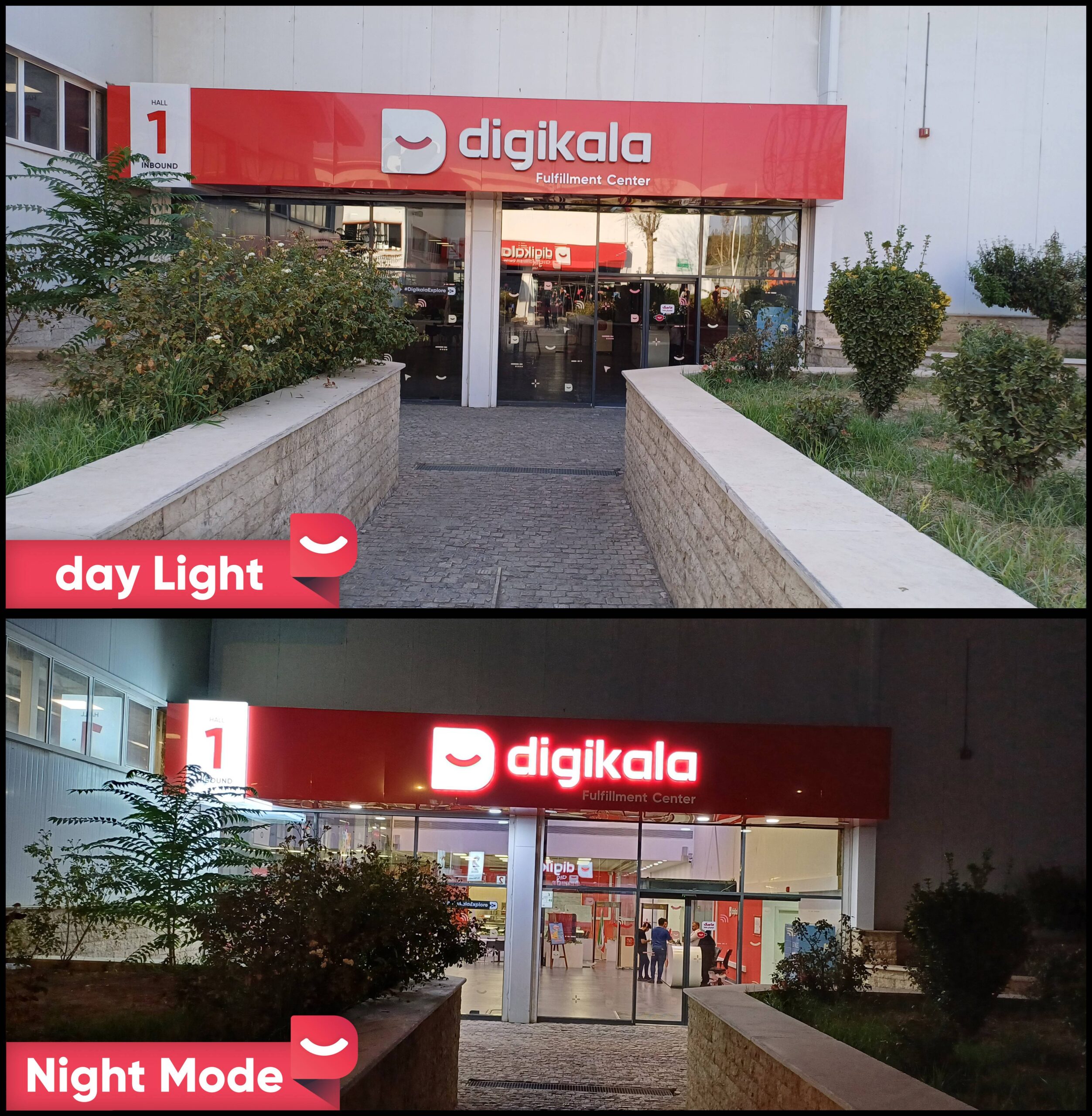 در عکاسی نور شب هم باید بگوییم که با توجه به تست‌های انجام شده و آنچه در تصاویر مشاهده می‌کنید، سنسور دوربین اصلی توانست خروجی تصاویر با روشنایی مناسب و کاملا قابل قبولی را ارائه کند. در بخش قابلیت نرم‌افزاری عکاسی حالت شب یا همان night mode که وظیفه حذف نویزهای موجود در نور شب را دارد باید بگوییم که در جایگاه یک گوشی میان‌رده عملکرد قابل قبولی داشته. با نگاهی به لوگوی دیجی‌کالا مشاهده می‌کنید و پراکندگی نور تا میزان مناسب و قابل قبولی کنترل شده است.