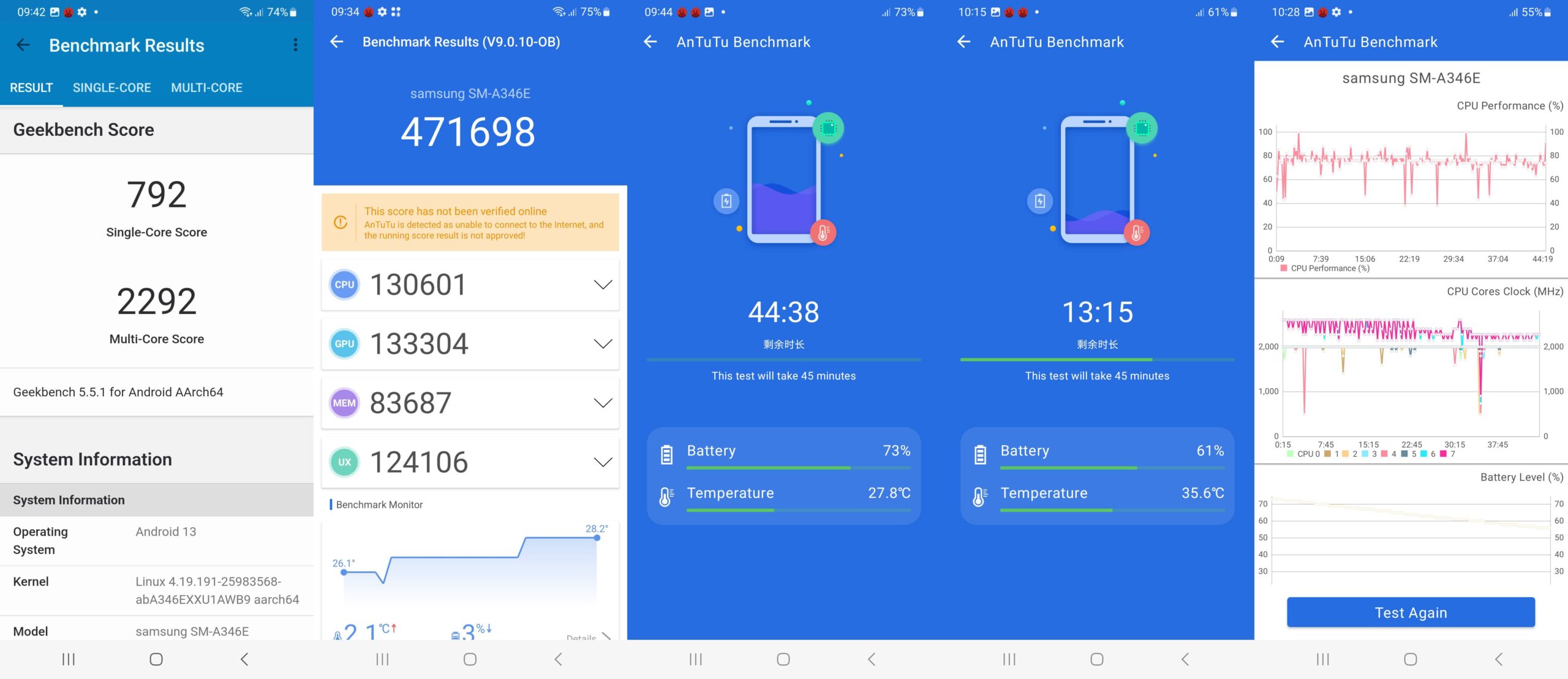 یکی از نقدهایی که به گوشی‌های میان‌رده سامسونگ در چند سال اخیر وارد بود، عملکرد نه‌چندان خوب مشخصات سخت‌افزاری و دمای نه‌چندان پایین آن‌ها بود. در کمال تعجب باید بگوییم که سامسونگ Galaxy A34 در بخش پردازنده و کنترل دما عملکرد بسیار خوبی داشته است. لازم به ذکر است که هرگاه دمای گوشی در حسن کار افزایش پیدا کرد، دلیل بر عملکرد ضعیف آن نیست و می‌تواند در برخی از موارد نشان‌دهنده انتقال خوب حرارت به بیرون باشد و همین امر سبب می‌شود تا عملکرد پردازنده کاهش پیدا نکند.