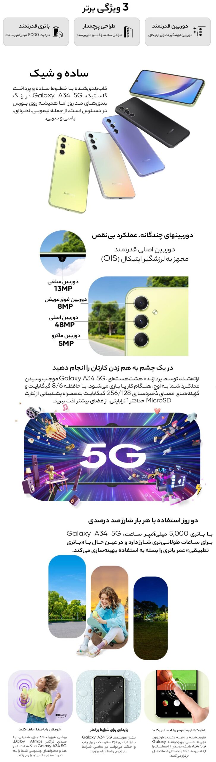 سامسونگ در زمینه گوشی‌های هوشمند میان‌رده تا به امروز توانسته است با معرفی محصولاتی با مشخصات فنی مناسب و قیمتی مقرون به‌صرفه، عملکرد بسیار خوبی را به نمایش بگذارد. سامسونگ Galaxy A34 5G هم یکی از این گوشی‌های هوشمند دوست داشتنی این شرکت است. صفحه‌نمایش جذاب و قدرتمند 6.6 اینچی این گوشی با رزولوشن بسیار خوب و نرخ بروزرسانی فوق‌العاده 120 هرتز، چیزی کم از یک پرچمدار ندارد و سامسونگ دوباره ثابت کرد که در زمینه صفحه‌نمایش هنوز هم حرف‌های بسیاری برای گفتن دارد. در بخش سنسور‌های دوربین هم سنسور دوربین عریض 48 مگاپیکسل این گوشی توانایی ثبت تصاویر بسیار جذاب و باکیفیتی را در نور روز و نور شب دارد. سنسور دوربین فوق‌عریض 8 مگاپیکسل این گوشی هم با زاویه دید 123 درجه، امکان ثبت تصاویر جذابی را در طبیعت و فضای باز دارد. سنسور دوربین 5 مگاپیکسل ماکرو هم برای ثبت تصاویر از فاصله نزدیک این گوشی را همراهی می‌کند. دوربین سلفی 13 مگاپیکسل این گوشی هم سوای عمکلرد بسیار خوب در نور روز، توانایی فیلمبرداری با نهایت کیفیت 4K را دارد. پردازنده دیمنسیتی 1080 شرکت مدیاتک هم این گوشی را همراهی می‌کند که سوای عملکرد بسیار خوب در اجرای بازی‌ها حتی سنگین، سبب شده تا این گوشی همانطور که از نامش پیداست، توانایی پشتیبانی از شبکه‌های اینترنتی نسل پنجم یا همان 5G را داشته باشد. باتری با میزان ظرفیت 5000 میلی‌آمپرساعت هم به ازای هر بار شارژ صد درصدی در حالت استفاده معمولی، طول عمر مفید (زمان آماده به‌کار) دو روز را ارائه می‌کند. در مجموع باید بگوییم که اگر به دنبال خرید گوشی میان‌رده‌ای هستید که از صفحه‌نمایشی در حد و اندازه یک گوشی پرچمدار، سنسورهای دوربین متنوع و قدرتمند و پردازنده مناسب برای اجرای بازی‌های سنگین بهره برده باشد، این گوشی می‌تواند یکی از بهترین انتخاب‌های ممکن باشد.