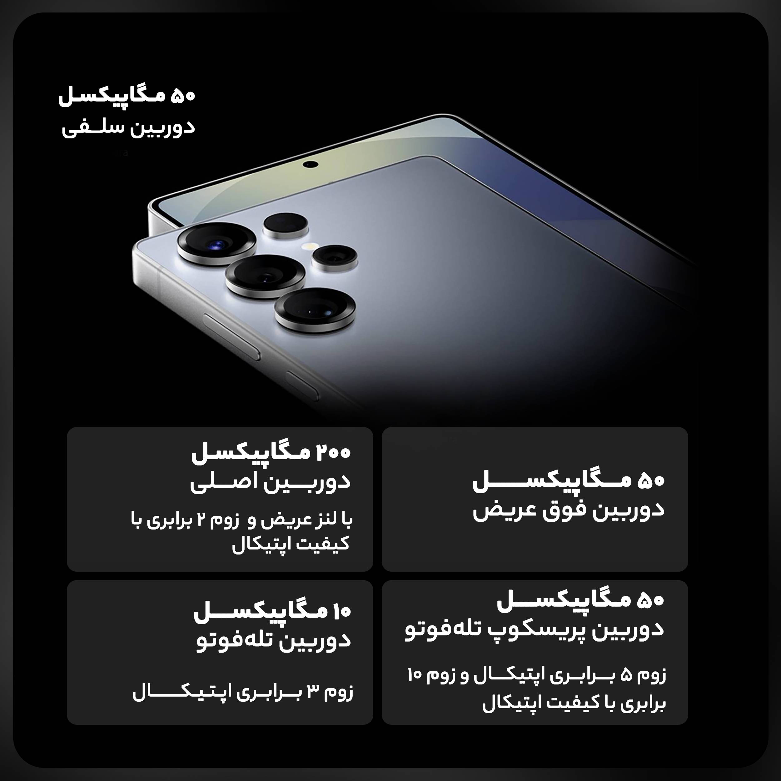 دوربین دوم، یک لنز 10 مگاپیکسلی تلهفوتو با زوم اپتیکال 3 برابر است که به شما این امکان را میدهد که از فاصله دور تصاویر واضح و شفاف بگیرید. همچنین، لنز 50 مگاپیکسلی پریسکوپ تلهفوتو با زوم اپتیکال 5 برابر، حتی بیشتر از این، فاصلهها را بدون افت کیفیت تصویر میسر میکند. و اما لنز جدید گوشیهای سامسونگ که یک پیشرفت بزرگ در S25 Ultra محسوب میشود، لنز50 مگاپیکسلی فوق عریض (Ultra Wide) است که برای ثبت تصاویر با زاویه دید وسیع و ثبت عکسهای دستهجمعی یا مناظر طبیعی بسیار مناسب است.
