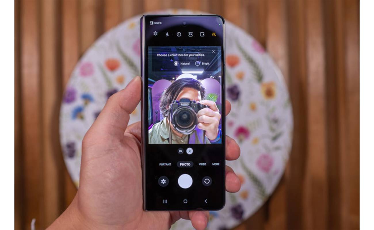 فاصله کانونی این لنز 26 میلی‌متر است که در محدوده‌ی لنزهای واید قرار می‌گیرد و زاویه دید مناسبی را ارائه می‌دهد. قابلیت ثبت تصاویر با پیکسل‌های 2 میکرومتری نیز به کیفیت بالای عکس‌ها کمک می‌کند.دوربین سلفی دوم دارای یک حسگر 10 مگاپیکسلی است که در بخش جلویی گوشی در حالت بسته قرار گرفته است. این دوربین نیز از یک لنز عریض بهره می‌برد.