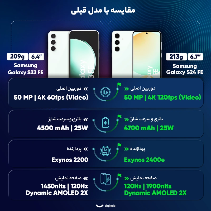 گوشی سامسونگ S24 FE در مقایسه با سایر پرچمداران بازار، قیمت بسیار معقول و رقابتی دارد. با توجه به ویژگیهای برجستهای که این گوشی ارائه میدهد، این قیمت میتواند بهعنوان یک سرمایهگذاری خوب در نظر گرفته شود. با ظرفیت داخلی 128 گیگابایت و رم 8 گیگابایت، این گوشی به کاربران اجازه میدهد تا بهراحتی برنامهها و بازیهای سنگین را اجرا کنند و در عین حال فضای کافی برای ذخیرهسازی عکسها، ویدیوها و دیگر فایلها داشته باشند. همچنین، این گوشی از ویژگیهای جذاب دیگری نظیر نمایشگر Dynamic AMOLED ۲X، دوربین با کیفیت و باتری با عملکرد خوب نیز بهره میبرد.