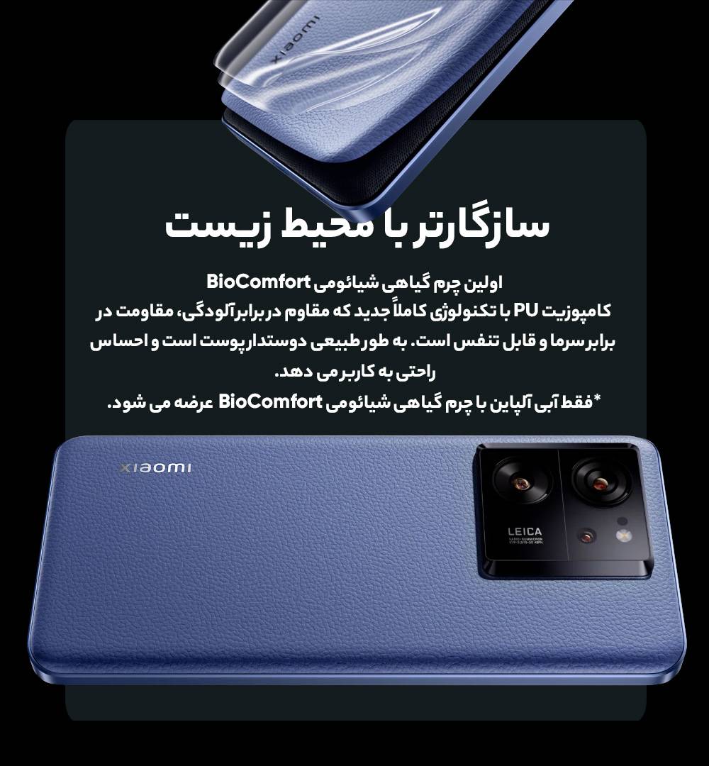 شیائومی در طراحی 13T Pro مسیری متفاوت را برگزیده است. با ابعاد ظریف 162.2×75.7×8.5 میلی‌متر و وزن متعادل 200 گرم، این گوشی تعریف تازه‌ای از خوش‌دستی را ارائه می‌دهد. نکته برجسته در طراحی، استفاده از فناوری انحصاری BioComfort در نسخه آبی رنگ است. این پوشش چرم گیاهی نه تنها ظاهری لوکس به گوشی بخشیده، بلکه گامی مهم در راستای حفظ محیط زیست به شمار می‌رود. ماژول دوربین با طراحی مربعی شکل و نشان لایکا، هویت متمایزی به پنل پشتی بخشیده است. لبه‌های خمیده و انحنای ظریف شیشه محافظ صفحه نمایش، تجربه استفاده یک‌دست را بهبود می‌بخشد. گواهی IP68 نیز اطمینان خاطر کافی برای استفاده در شرایط مختلف را فراهم می‌کند.