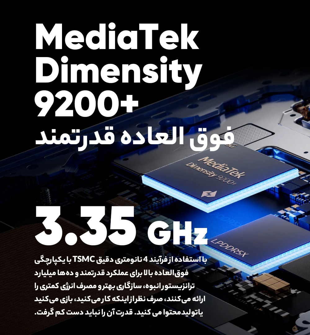 تراشه MediaTek Dimensity 9200+ با معماری پیشرفته چهار نانومتری TSMC، نقطه عطفی در عملکرد این گوشی به شمار می‌رود. هشت هسته پردازشی با چینش هوشمندانه شامل یک هسته Cortex-X3 با فرکانس 3.35 گیگاهرتز، سه هسته Cortex-A715 و چهار هسته Cortex-A510، توازن مطلوبی بین قدرت و مصرف انرژی برقرار می‌کنند. پردازنده گرافیکی Arm Immortalis-G715 با معماری نوین خود، تجربه بازی و پردازش تصویر را به سطحی بالاتر می‌برد. حافظه رم 12 گیگابایتی در کنار حافظه داخلی 512 گیگابایتی، فضای کافی برای ذخیره‌سازی و اجرای روان برنامه‌ها را فراهم می‌کند.