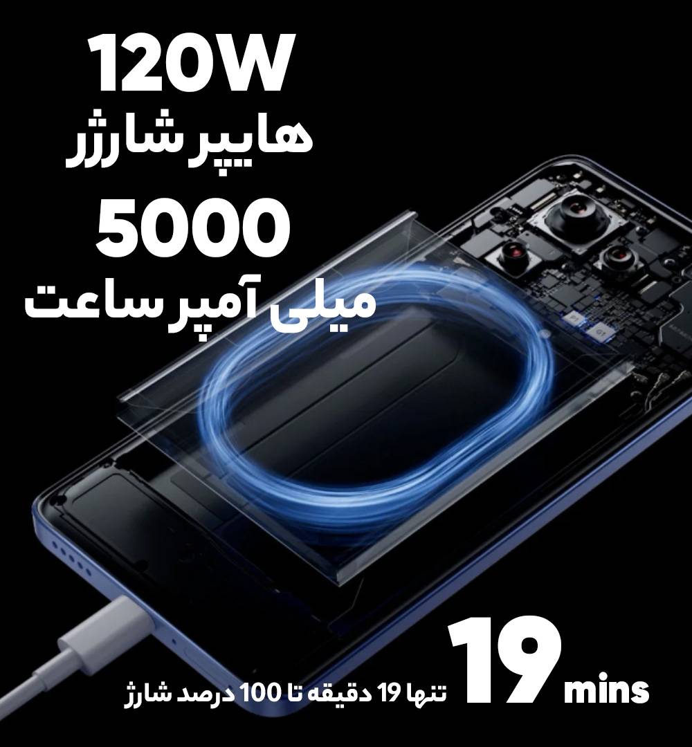باتری 5000 میلی‌آمپر ساعتی با فناوری شارژ فوق‌سریع 120 واتی، نگرانی‌های مربوط به شارژ را به حداقل می‌رساند. این فناوری پیشرفته امکان شارژ کامل گوشی در زمانی کوتاه را فراهم می‌کند. بهینه‌سازی‌های نرم‌افزاری و سخت‌افزاری، عمر مفید باتری را در استفاده روزمره تضمین می‌کنند. فناوری شارژ هوشمند این گوشی با استفاده از الگوریتم‌های پیشرفته، الگوی شارژ را با عادات کاربر تطبیق می‌دهد. این ویژگی باعث افزایش طول عمر باتری در درازمدت می‌شود. همچنین، سیستم خنک‌کننده پیشرفته حین شارژ سریع، از افزایش دمای بیش از حد جلوگیری می‌کند.