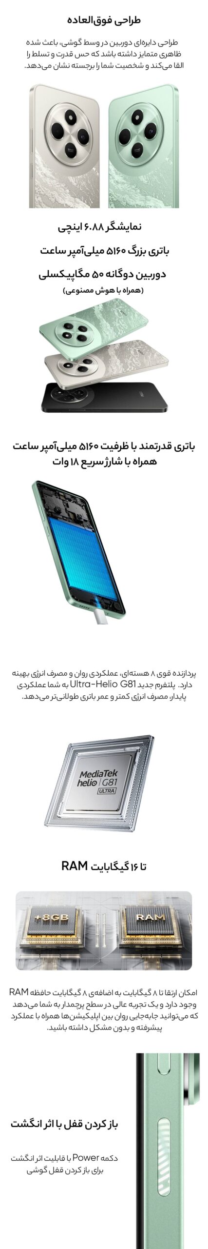 گوشی Poco C75 شیائومی یک انتخاب عالی برای کاربرانی است که به دنبال ترکیبی از کارایی، طراحی جذاب و قیمت مناسب هستند. با وجود نمایشگر بزرگ 6.88 اینچی، پردازنده کاربردی Helio G81 Ultra، دوربین 50 مگاپیکسلی و باتری قدرتمند 5160 میلیآمپری، این گوشی میتواند برای استفاده روزمره و حتی کارهای متوسط مانند بازی و تولید محتوا کاملاً مناسب باشد. رابط کاربری HyperOS بر پایه اندروید 14 نیز تجربهای مدرن و روان از کار با این گوشی را فراهم میکند. در مجموع POCO C75 یک گوشی اقتصادی از سری پوکوی شیائومی است که در برخی ویژگیها شبیه یک میانرده عمل میکند و این عامل باعث افزایش محبوبیت آن شده است. اگر شما هم به دنبال یک گوشی با امکانات کامل، طراحی زیبا و قیمت مناسب هستید، POCO C75 انتخاب ایدهعالی برای شما خواهد بود.