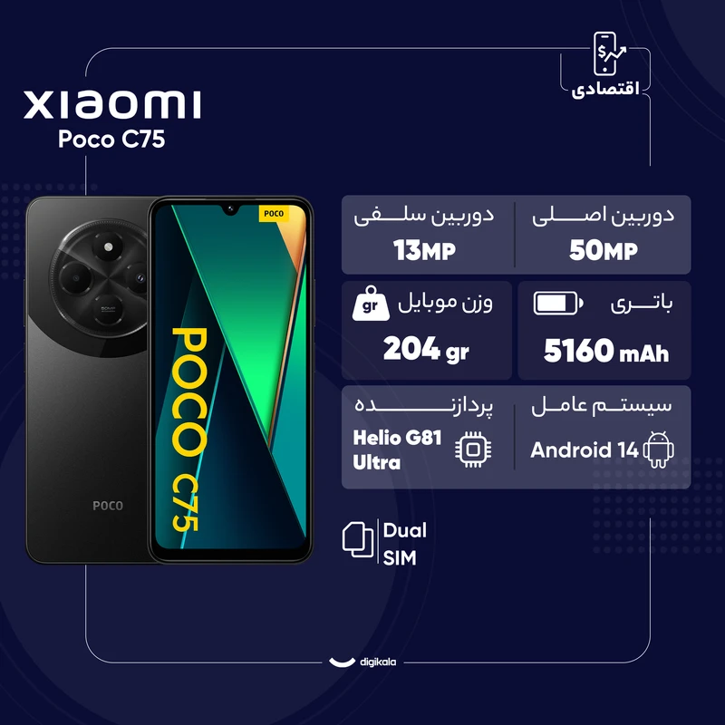 گوشی Poco C75 شیائومی یک انتخاب عالی برای کاربرانی است که به دنبال ترکیبی از کارایی، طراحی جذاب و قیمت مناسب هستند. با وجود نمایشگر بزرگ 6.88 اینچی، پردازنده کاربردی Helio G81 Ultra، دوربین 50 مگاپیکسلی و باتری قدرتمند 5160 میلیآمپری، این گوشی میتواند برای استفاده روزمره و حتی کارهای متوسط مانند بازی و تولید محتوا کاملاً مناسب باشد. رابط کاربری HyperOS بر پایه اندروید 14 نیز تجربهای مدرن و روان از کار با این گوشی را فراهم میکند. در مجموع POCO C75 یک گوشی اقتصادی از سری پوکوی شیائومی است که در برخی ویژگیها شبیه یک میانرده عمل میکند و این عامل باعث افزایش محبوبیت آن شده است. اگر شما هم به دنبال یک گوشی با امکانات کامل، طراحی زیبا و قیمت مناسب هستید، POCO C75 انتخاب ایدهعالی برای شما خواهد بود.