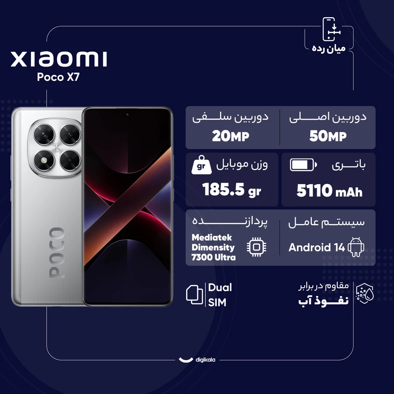شیائومی پوکو X7، جدیدترین میان‌رده پریمیوم این برند است که در اوایل سال ۲۰۲۵ معرفی شد و در مدت زمانی کمی پس از انتشارش توانسته به فروش بسیار خوبی دست پیدا کند. این گوشی با ترکیب طراحی مدرن، سخت‌افزار بهینه و امکاناتی که پیش‌تر بیشتر در پرچمداران دیده می‌شد، به گزینه‌ای قابل توجه برای کاربرانی تبدیل شده است که به دنبال توازن میان قیمت و کارایی هستند. قاب جلویی با پوششی از شیشه گوریلا گلس Victus 2 محافظت می‌شود که مقاومت بالایی در برابر خط و خش و ضربه دارد. قاب پشتی بسته متناسب با نسخه، یا از پلاستیک باکیفیت ساخته شده یا از پوشش پلیمر سیلیکونی با ظاهر شبیه به چرم استفاده می‌کند که علاوه بر زیبایی، حس لمسی مطلوبی ایجاد می‌کند. استاندارد مقاومتIP68 ، تضمین می‌کند که دستگاه در برابر گردوغبار و نفوذ آب تا عمق ۱.۵ متر به مدت ۳۰ دقیقه مقاوم است.